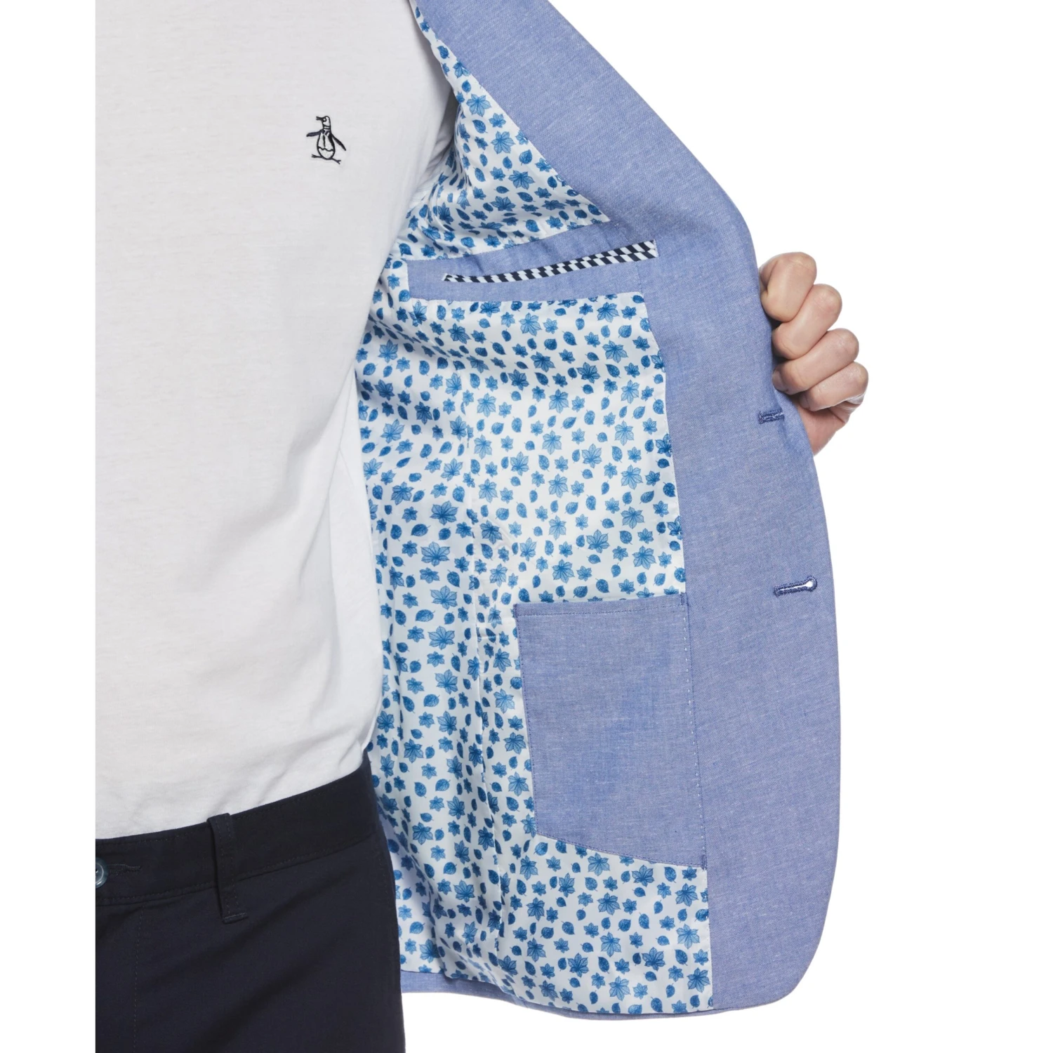 The two-toned look of chambray fabric meets a classic plaid pattern in this sharp Original Penguin sport coat. The men’s blazer jacket is crafted with a linen-cotton blend and soft jersey fabrication for breathable comfort. The design features notched lapels and two-button closure for a sleek, modern look. Two straight flap pockets, one welt chest pocket and four interior pockets provide ample storage space for your essentials. The slim fit suit jacket is fully lined, with added stretch to help provide a full range of motion. Easy to dress up or down for any occasion, this versatile linen blend blazer comes in an eye-pleasing shade of blue that will help your style stand out from the pack..